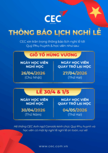 Hòa chung không khí kỷ niệm các ngày lễ lớn của dân tộc: Giỗ Tổ Hùng Vương, Ngày Giải phóng miền Nam 30/4 và Quốc tế Lao động 1/5, Hệ thống CEC Anh ngữ Canada xin trân trọng thông báo lịch nghỉ lễ như sau: